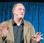 Knochen, und er beißt nicht auf Granit. Das Publikum geht mit.